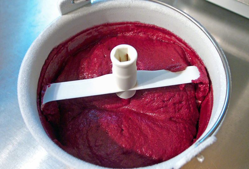 Process in an ice cream maker according to the manufacturer. Despite bringing the wine to a boil for two minutes, there will still be some alcohol remaining, slowing down the freezing process. I left my ice cream machine on an additional 20 minutes or so.