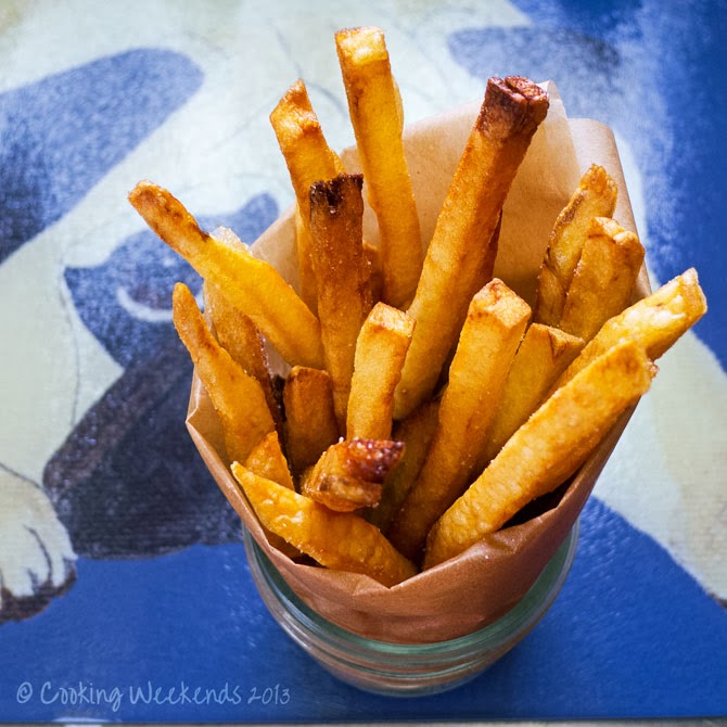 I have never made proper french fries. The closest I have come are the oven baked sweet potato fries which I love and make frequently. This year at our company white elephant gift exchange I received a lovely cutting board with a picture of a dog on it (it looks like a pug), a five pound bag of russet potatoes and a french fry cutting tool. To both my surprise and relief, not one person tried to "steal" my gift!